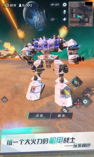2.组装战斗机械臂,穿越太空宇宙,太空冒险史诗战斗,在这里展开独特探险玩法,跨过火山口穿越无尽星空,感受多人联机沙盒对战的激情乐趣,组装无数不同的模块;
