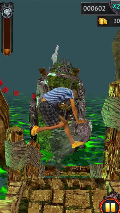 3、左右滑动手指控制角色转身,向上滑动跳跃,向下滑动滑动跪下进入树洞,后期的挑战的速度会越来越快;