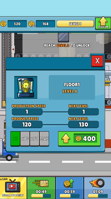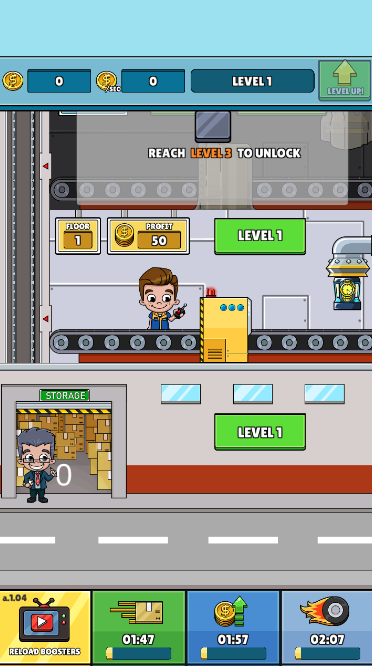 闲置盒大亨中玩家可以出售物品,成为一个空闲箱大亨,并成长多个工厂,出售手表,纺纱,电视,智能手机,管理自己的工厂,并自动化工作流程即便你不在游戏,工作站也会继续生产,赢得并投资这个快节奏的空闲游戏!