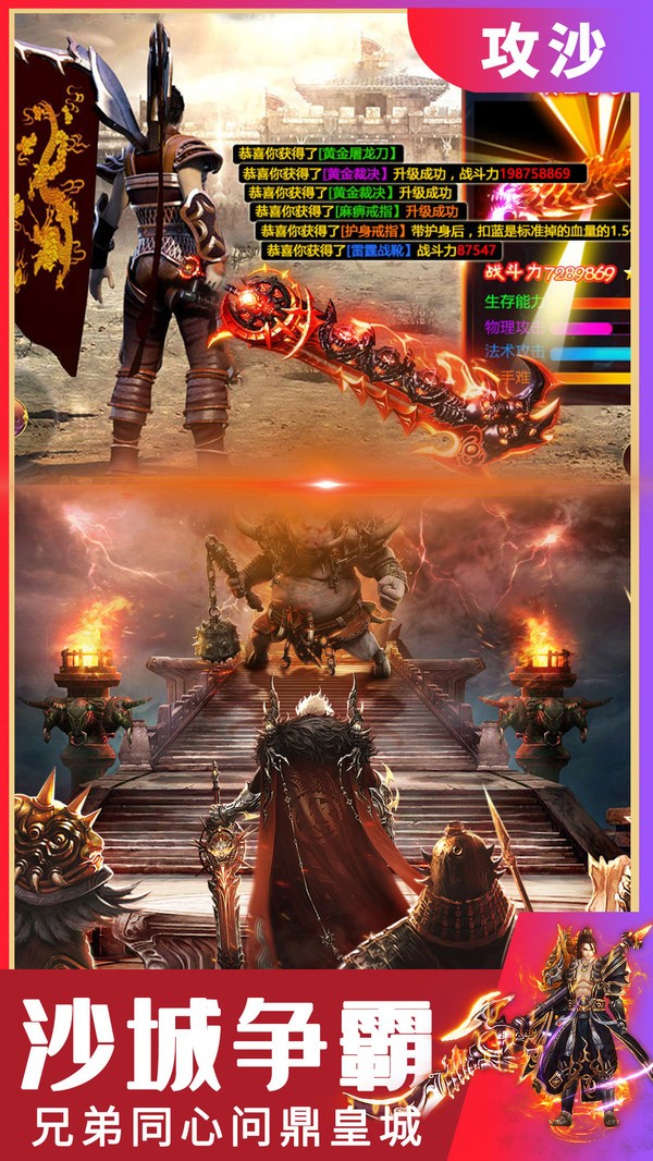 4.重温昔日荣光,结合经典MMO玩法,游戏内还有超值元宝赠送,在线同屏对战升级画面,一览无余的沙城风光。