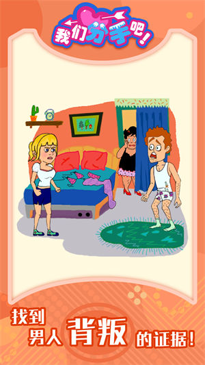 我们分手吧游戏是一款找到男人背叛证据的剧情游戏,从房间里的任何布置和场景探索男人出轨的证据,证明他确实有过错然后跟他分手,作为女朋友就要有这样的敏锐性,秒速上手非常直观操作。