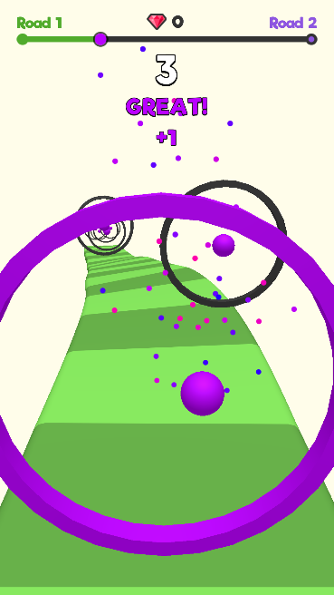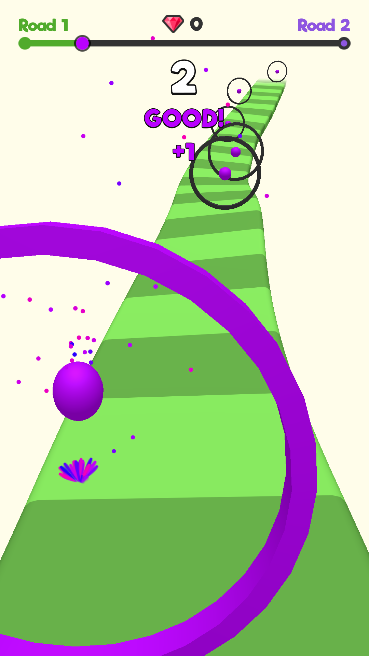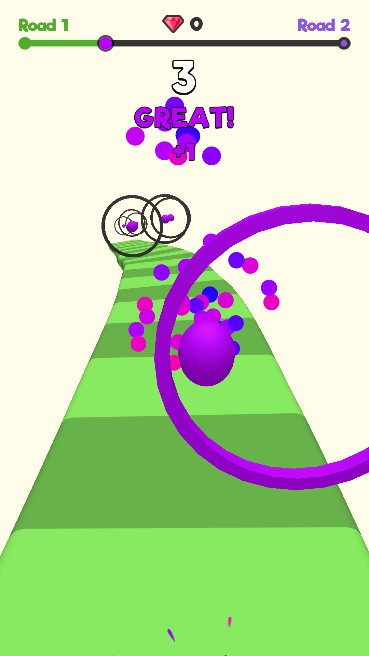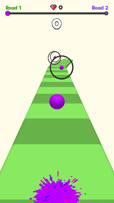 有着清爽的游戏画面,简洁的跑道和障碍,以及一个有黑白相间的方块与圆环组成的终点,玩家只需要让软胶球在前进的过程中躲避开障碍圆环,安全抵达终点,即可通过当前关卡!