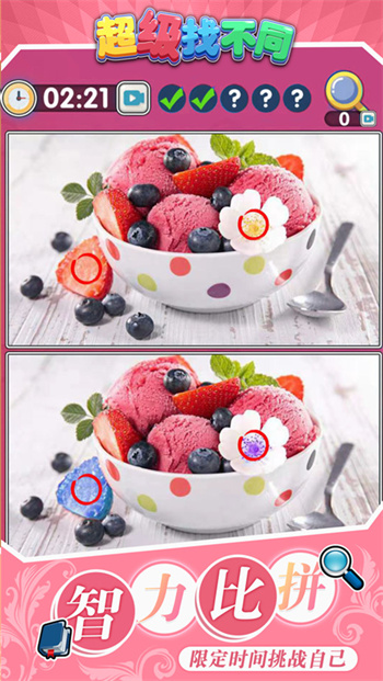3、有一定的时间限制,快速的找到不同的位置就能够顺利通关了,快速找到图片之间的差异;