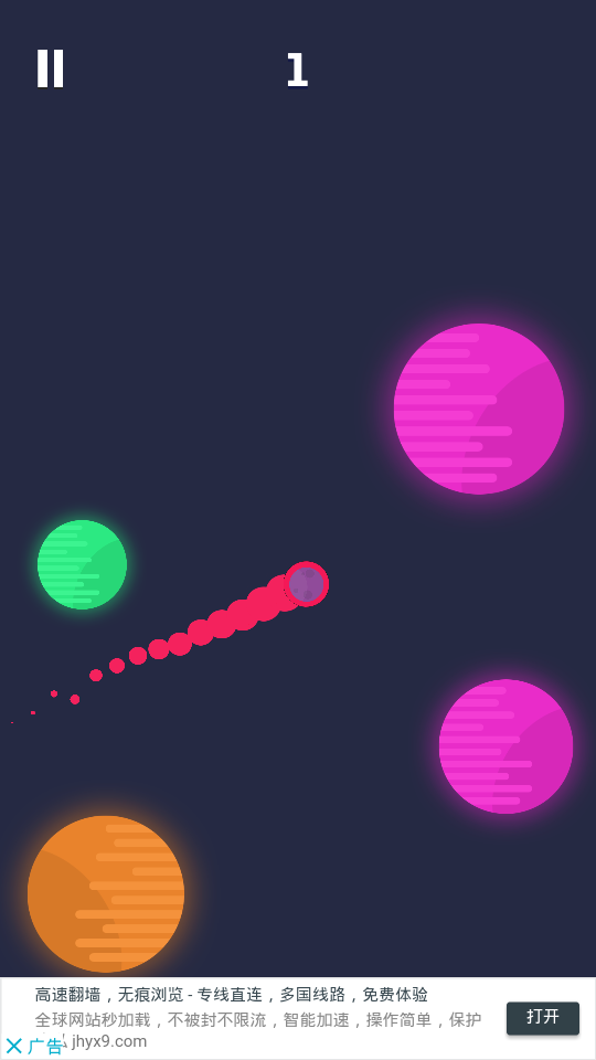 超级小行星游戏中玩家要操作带有尾巴的小行在宇宙中冒险,你点哪里它就会移动到哪里去,小心不能碰到其它的行星,很考验你的技巧,同时也是很难的挑战,收集多的星星然后解锁好看的外形吧!