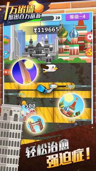 这是一款与众不同的模拟类休闲小游戏。在游戏中,玩家将化身为一位勤劳擦墙工,靠清洁墙壁来换取金币环游世界。动一动手指,抹去墙上的污渍和顽垢;擦一擦墙壁,展现出一座城市的风土和情怀。在愉快的劳动中获得百万金币,升级劳动工具,提高擦墙效率。