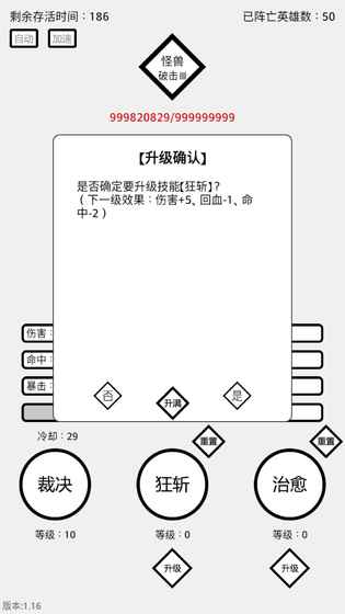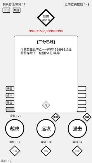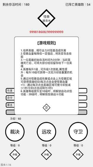 安卓下载 大小:1.39MB 下载:202次 三分英雄 冒险游戏英雄 支 持:安卓 分 类:手机游戏 大 小:1.39MB 版 本:1.18 下载量:202次 发 布:2022-05-10 08:52:29 特 色:三分英雄游戏下载_三分英雄安卓版下载 安卓下载 #三分英雄截图 #三分英雄简介 三分英雄是一款全新好玩刺激的文字修仙冒险游戏,游戏拥有着极简的美术画面,玩家需要培养英雄角色来击败各式各样的怪物boss、轻松有趣的的放置挂机玩法,喜欢的小伙伴快来下载吧!游戏特色1、极简的美术画面,简约而不失精美!2、简单易上手的操作系统,随时随地都可以来上一把!3、轻松舒适的背景音乐和音效,给你沉浸式的游戏体验!4、多元化丰富的游戏模式,想怎么玩就怎么玩!编辑推荐培养英雄,竭尽全力对怪兽造成伤害,怪兽血量每降低一定值后,将改变攻击技能,一位英雄初始存活时间为3分钟;当前英雄死亡后,可将大部分经验留存给下一位英雄!