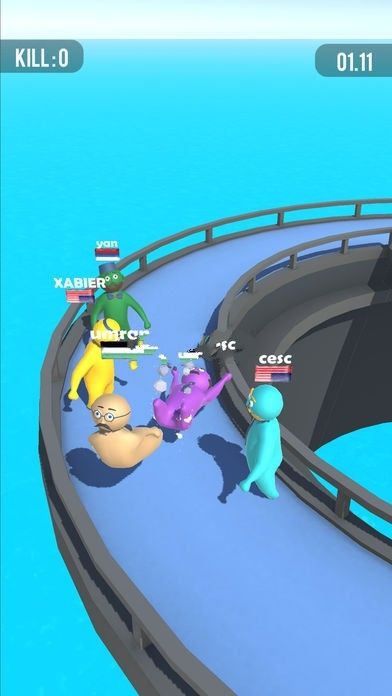 一款以物理玩法为主的联机大作战游戏,在游戏中所有的玩家将在同一个平台上战斗,一旦被扔出平台下就会失败,如果你连续被攻击就会晕倒,晕倒了就会被人扔出去,游戏的玩法非常清奇搞笑,玩起来欢乐,你也可以和好友一起并肩作战,团队配合玩起来更给力。