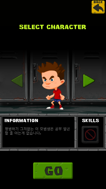 僵尸学校是一款十分另类的打僵尸休闲游戏,在游戏中玩家通过操作小男孩在僵尸之城中和僵尸精心格斗闯关,游戏中还会出现巧克力、金币等不同的游戏道具,收集它们使用道具能后大量提升战斗力,非常的惊悚刺激好玩!