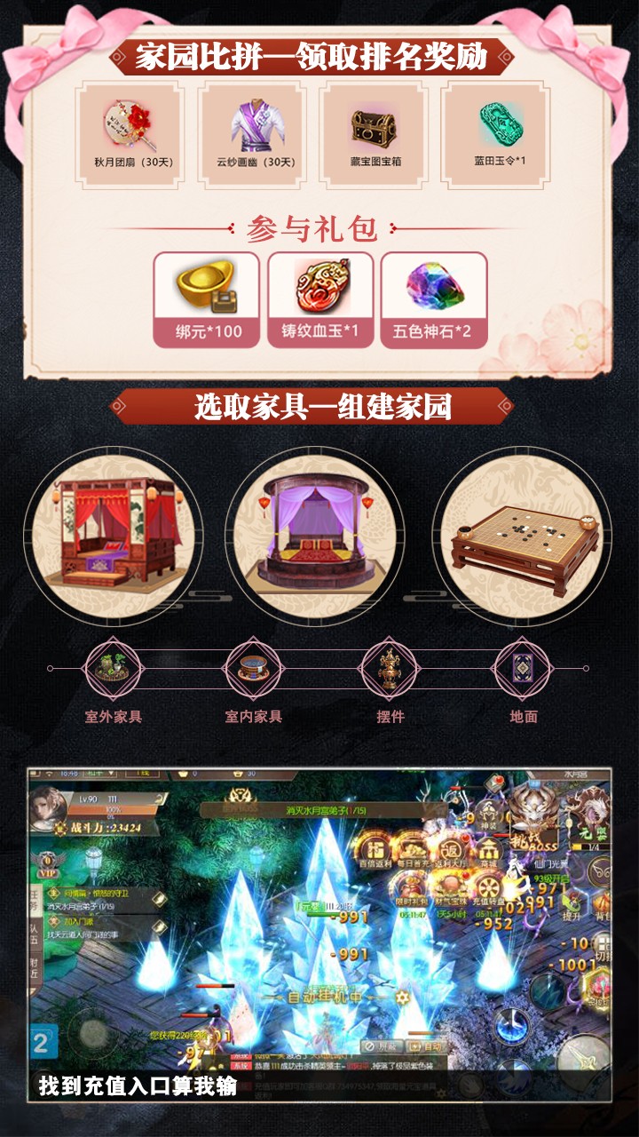 1.上线即送超级VIP,元宝1888,绑定元宝88666,金币200w,让你称王快人一步! 2.所有VIP豪华礼包直接领取!直接毕业!都不用充钱了! 3.月卡到达条件免费送!免费送!免费送!重要的事情说三遍 4.充值比例1:500 首充比例1:1000!不定期举行限时首充翻倍活动噢! 5.精彩限时装备等你来抽取,积分榜第一名可获得丰厚奖励哦! 6.线下充值返利,元宝拿到手抽筋。线下活动礼包,让你一步成仙! 7.线上每日活动不停歇!在线即领取!