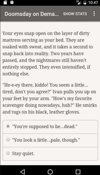 在这个趣味的世界之中将会为你展现一个极致精彩有趣的剧情冒险的挑战,让你能感受这个独特的末日世界之中的精彩冒险挑战,面对各种各样的选项去做出正确的选择,让你能成功的在这个末世之中努力的存活下去。