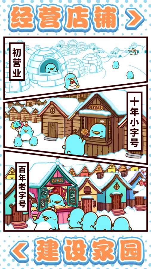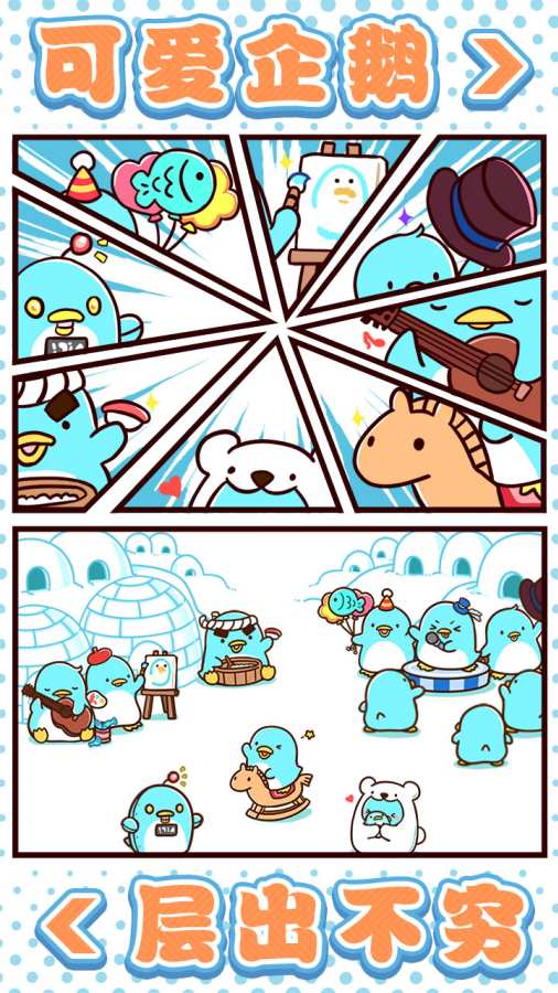 这是一款悠闲的小游戏,可爱的企鹅们将在空寂的冰块上建筑属于自己热闹又可爱的城镇,随着居民的不断增多,可以通过合成获得新的企鹅居民,从而解锁企鹅图鉴!