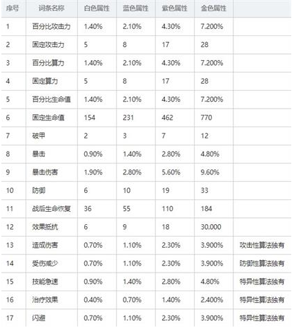 算法有三种稀有度,分别是 蓝 紫 金 蓝色主词条属性×5=紫色主词条属性×2=金色主词条属性。 算法有一格和两格算法 一格主词条属性×2=两格主词条属性