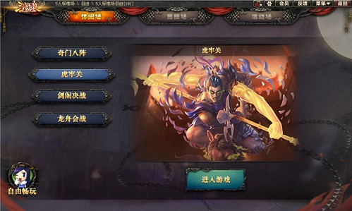 进入虎牢关玩法后,三名玩家可扮演先锋、中坚、大将组成的联合军,合力对抗神吕布。联合军击败神吕布,则三名玩家获胜;联合军全部阵亡或牌堆洗牌两次,则三名玩家失败。