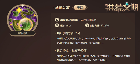 要判断一个英雄是否强势,那么技能往往是他的第一个评判标准。枯导师·亚斯加特拥有主动技能“新绿绽放”,能够为其他友方英雄回复兵力(治疗率50%,受智力影响),并为兵力最少的我方英雄再次回复兵力(治疗率65%,受智力影响),十分契合他的辅助定位。同时,定向恢复效果,也让他成为了脆皮英雄的救星,甚至有机会扭转战局。