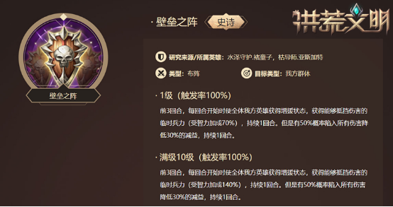于此同时,枯导师还可以用于拆解技能——壁垒之阵。作为一个布阵技能,壁垒之阵可以在前三回合能为己方稳定提供增援状态,且技能系数并不低,但有概率使己方陷入伤害降低的减益。这意味着它的能力在面对特定敌人时才会展现出真正的威力,比如面对前三回合有高额爆发输出的盖世神猴队伍。当然,壁垒之阵也适用于需要在前三回合降低损耗的阵容,如在索列姆队伍中保证核心英雄索列姆在开局三回合后的兵力数量。