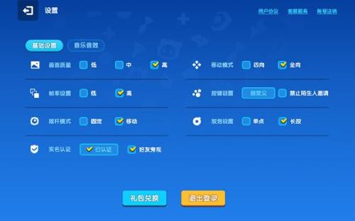 《全民泡泡超人》设置项不多,分为“基础设置”和“音乐音效”两个大类。