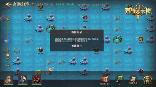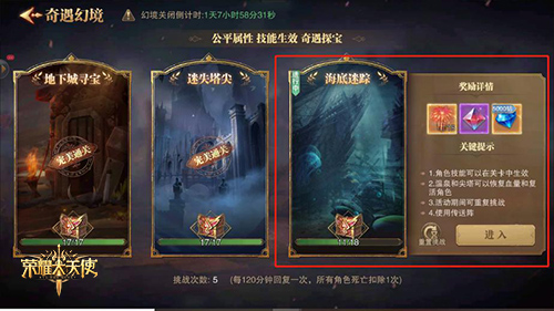 尘封已久的古老秘卷,记载了勇者大陆不为人知的传奇。无数学者经过百年时间,终于破解了其中一篇的奥秘,他们以九阶禁咒—通晓语言译出了龙语下掩藏的幻境之谜。那是掌握禁忌力量的钥匙,也是通往无尽深渊的大门。面对诸神权柄—宝藏神器的诱惑,无数勇者踏上了“奇遇幻境”的惊心冒险。地下城寻宝、迷失塔尖、直至即将出现的海底迷踪。在《荣耀大天使》特定活动时间,地下城寻宝,迷失塔尖,海底迷踪将依次解锁出现。作为终极关卡的—“海底迷宫”将在奇遇幻境开启的第五天解锁。需要注意的是,活动挑战有次数限制,次数使用完将无法进入关卡。