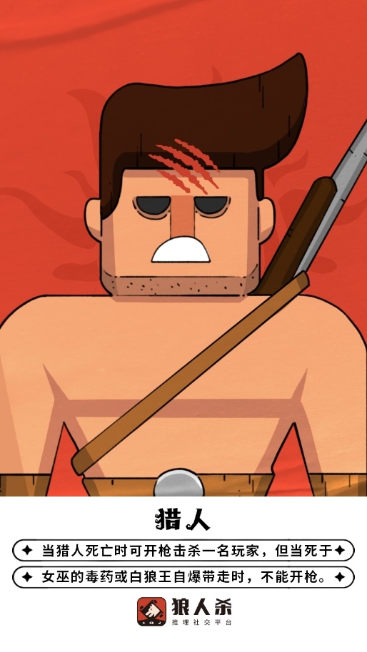 尽管猎人有一副"舍我其谁"的霸气外貌,但在游戏玩家的手中,猎人却是个内向兼修型的神民。猎人之所以在白天明身份的时候没有玩家敢攻击他,主要原因是他的技能可以杀死任意一名玩家,但是他的技能和女巫的毒药一样不稳定。猎人应该在游戏对局的前期尽量低调形式,直到自己能找到合适的猎物之前不要去过多暴露自己的底牌,这样可以帮助自己的技能能够稳定的攻击狼人。