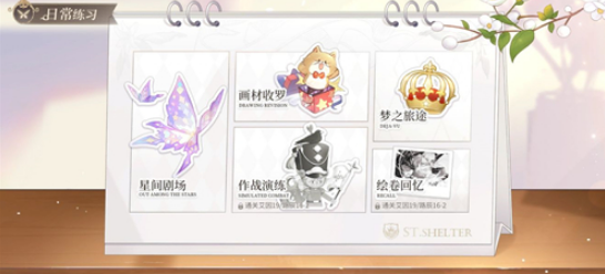 没错,只有将角色卡升到当前的等级上限,突破的功能才会显现,这也是找不到突破的根本原因。至于突破材料的获取,可以在【日常练习】-【画材收罗】这里刷,点进去就会显示对应材料关卡的开放时间。