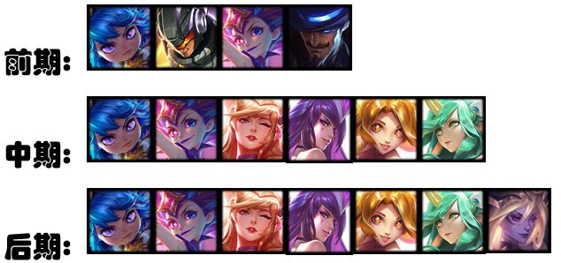 2阶段速升4人口,波比、蕾欧娜、佐伊、卡牌,组成2重装2未来,卡牌带法强装、蓝量装打工。