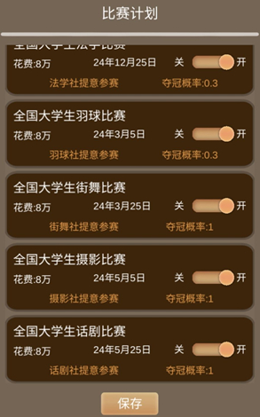 赛事是跟社团对应的,每个赛事都是6w块钱,不差钱可以考虑,赛事是发展社团的重要方式。每次参加赛事都可以提高社团的人气,进而提高等级。因为还在前期,没获过奖,不知道奖金可观不可观。