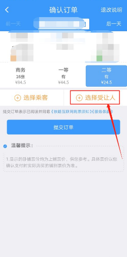选择车次信息后面带【兑】字的列车,选择一等座、二等座或者商务座,点击【选择受让人】。