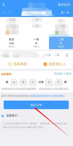 选择受让人后,点击右上角【完成】,选择座位之后点击【提交订单】,积分兑换车票成功。