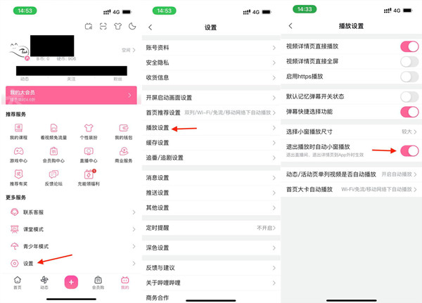 也可以进步哔哩哔哩设置,点击播放设置,关闭【退出播放时自动小窗播放】。