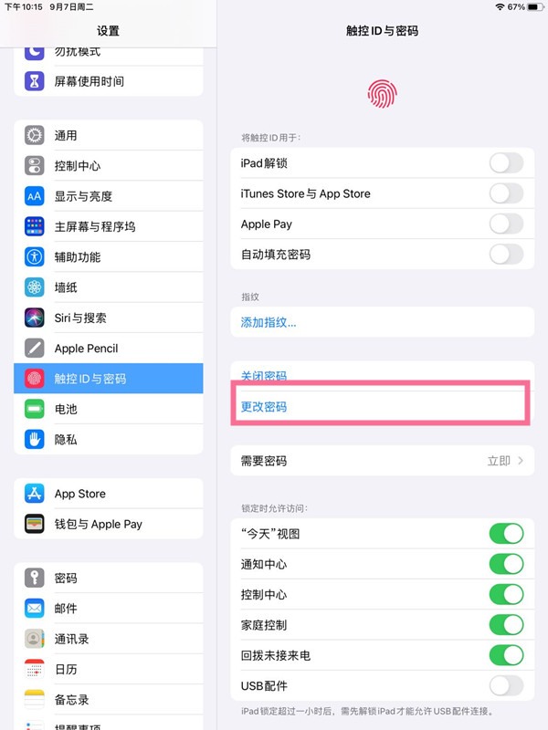 1、在平板设置中点击【触控ID与密码】,输入旧的密码。