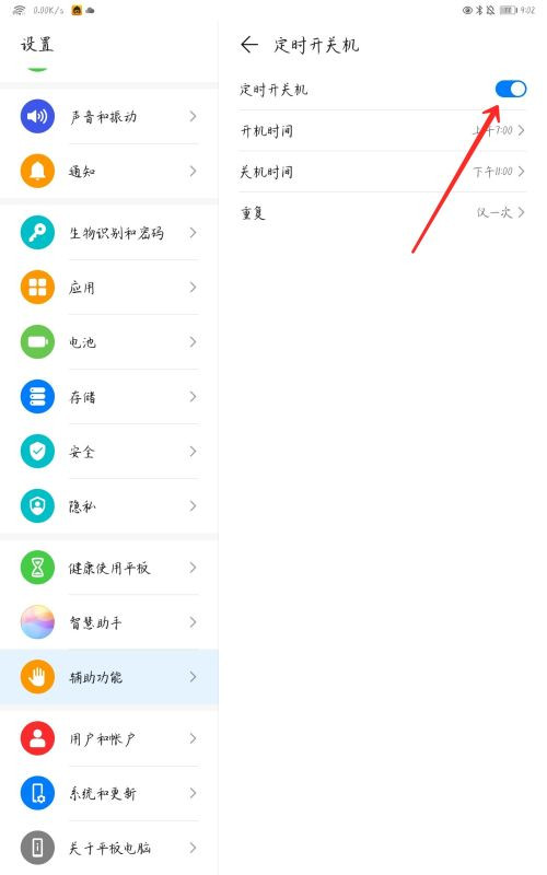 1、在平板辅助功能设置菜单中点击【定时开关机】。