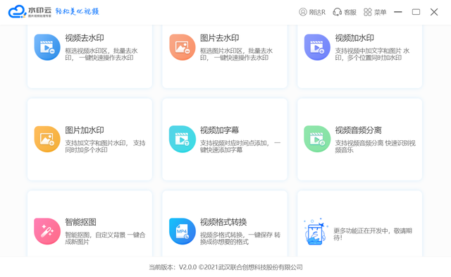 1、在电脑中打开该视频处理工具,界面中会显示有八大操作,这款工具既可帮助我们一键去除视频水印,也可以帮助我们在视频和图片上面添加水印。我们这里要去除水印里面的文字水印,自然就点击选择“视频去水印”了。