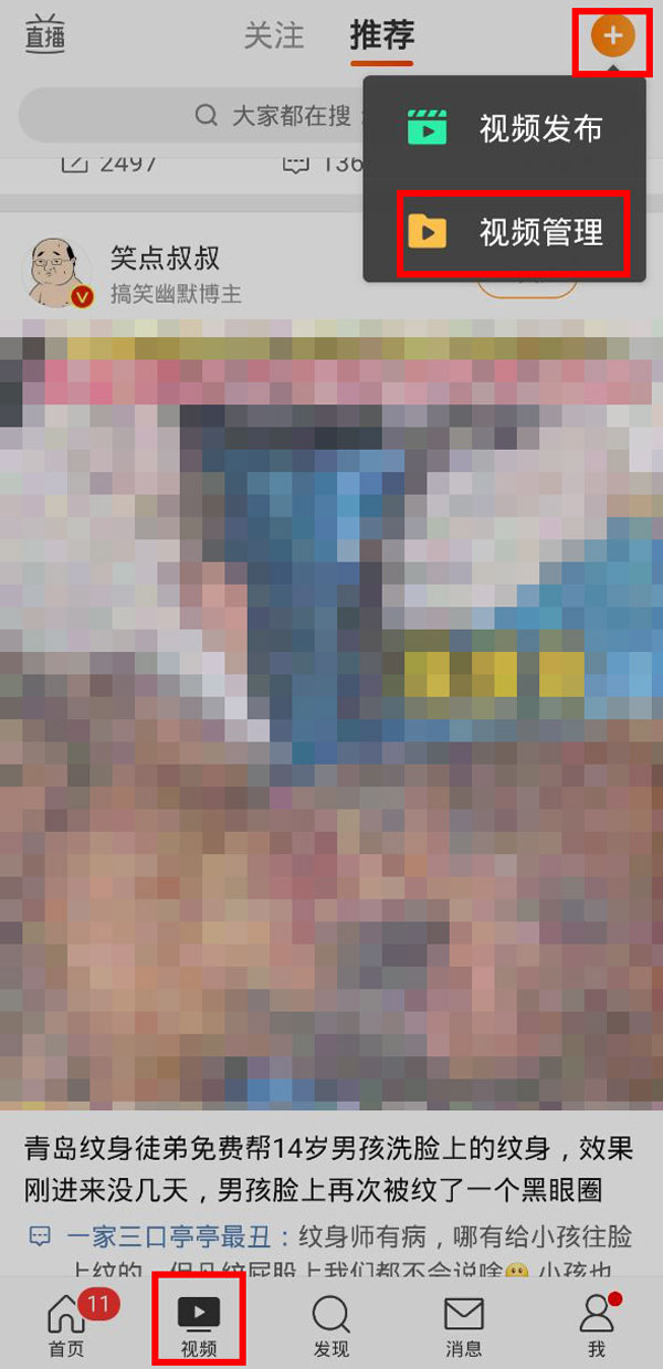 2、打开微博>视频,点击右上角+号,点击视频管理,点击我的缓存,点击需要观看的缓存视频。