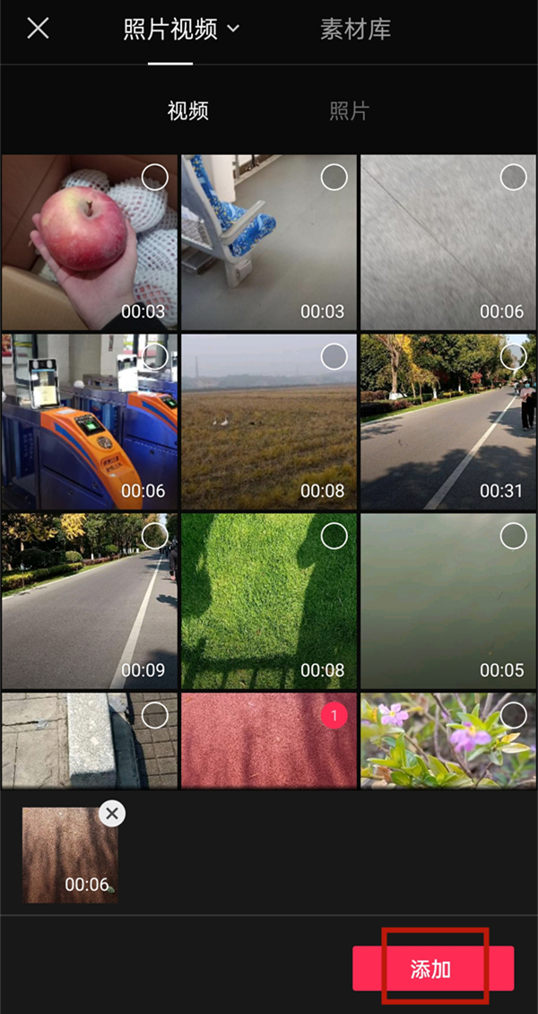 2、选择视频后,点击添加。