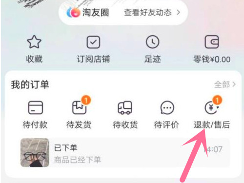 1、打开淘宝app,点击右下角我的淘宝,点击【退款/售后】。