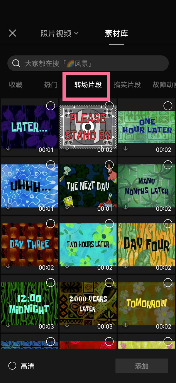 2、在“素材库”页面点击【转场片段】即可使用转场特效。