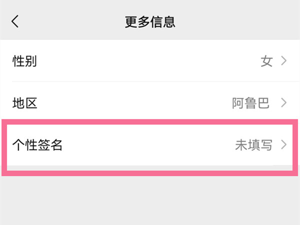 3、在更多信息页面,点击【个性签名】,设置签名后即可在朋友圈主页显示。