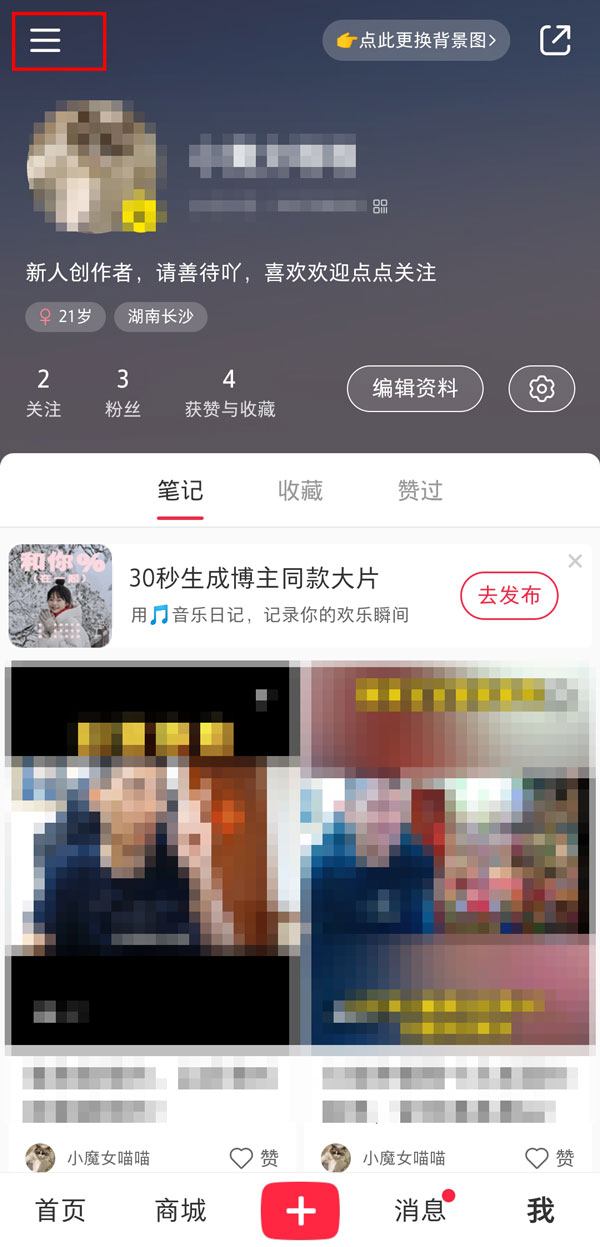 1、打开小红书,点击【我】,点击左上角三横图标。