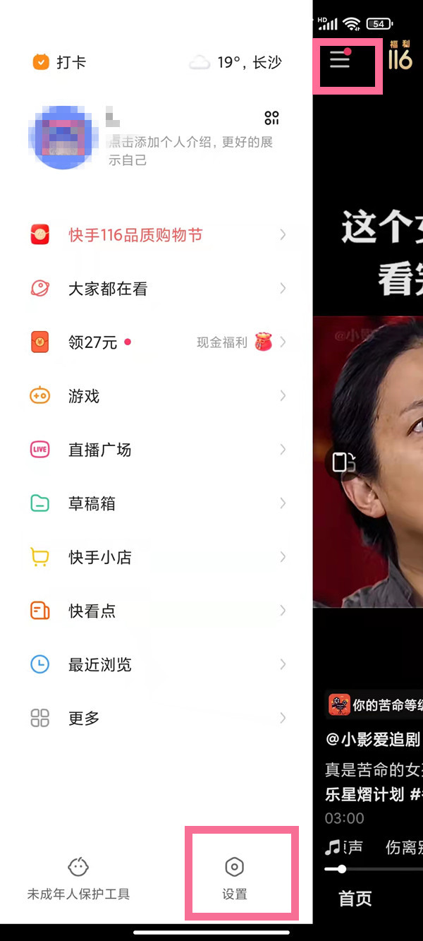 1、打开手机快手,点击左上角三横,选择【设置】。