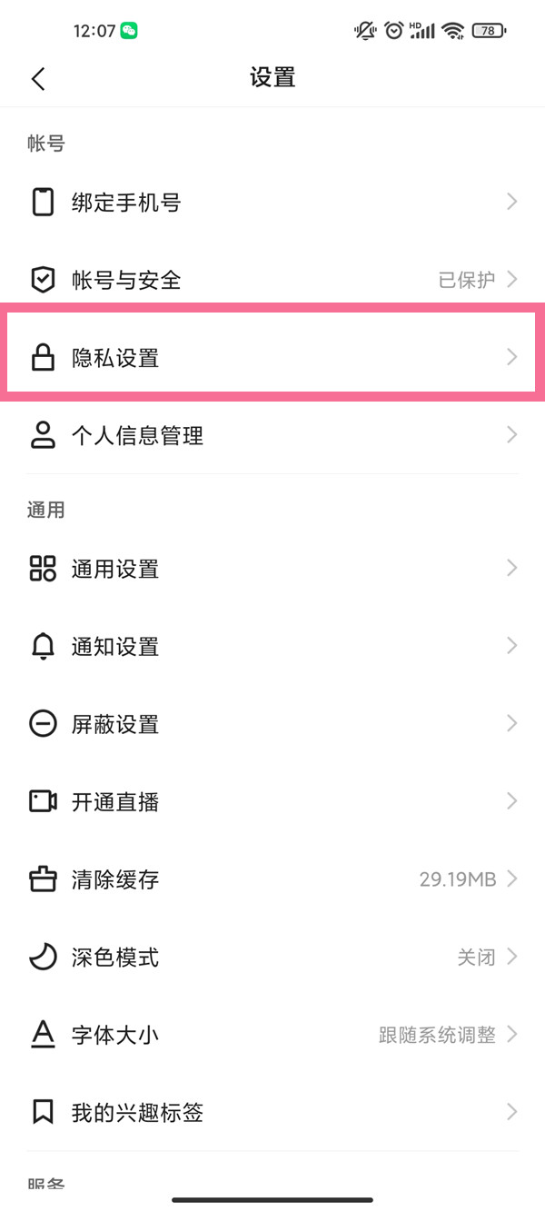 2、点击【隐私设置】选项。