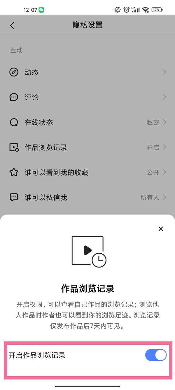 3、点击【作品浏览记录】并开启该功能即可。