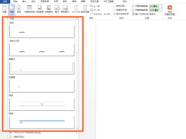 2、在设计界面点击页脚,选择需要设置的页脚类型即可。