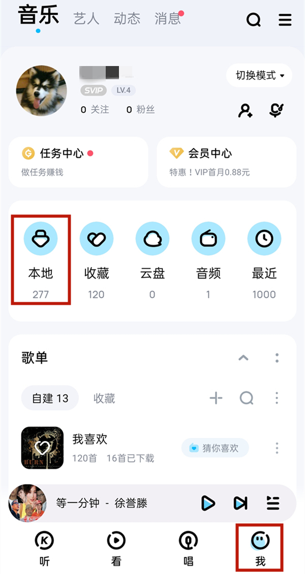 1、打开酷狗音乐,点击我,点击本地。