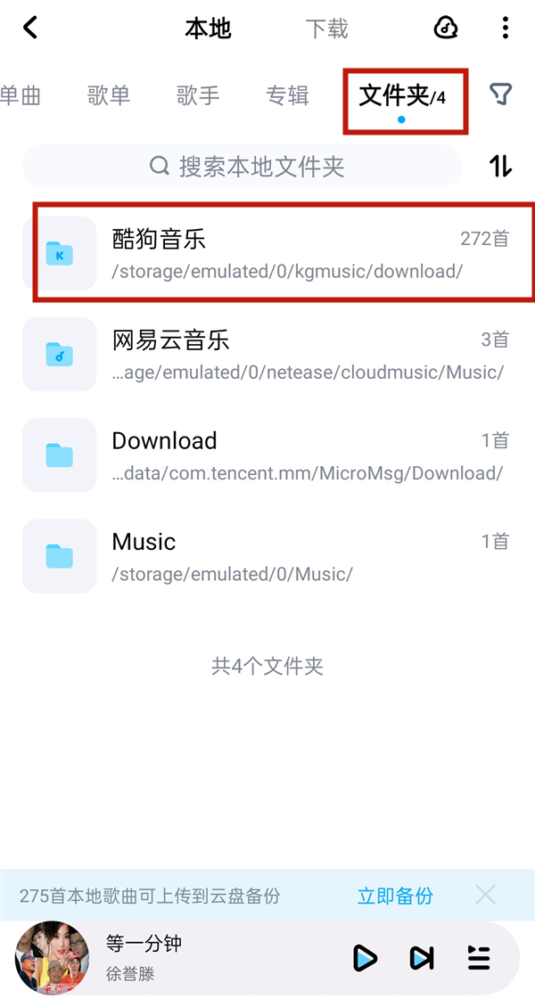 2、点击文件夹后,即可看到酷狗音乐下载的文件在/storage/emulated/0/kgmusic/download文件夹里。