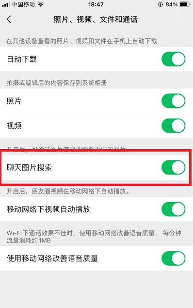 5、最后就可以在其功能页面中找到【聊天图片搜索】点击打开右边的按钮即可。