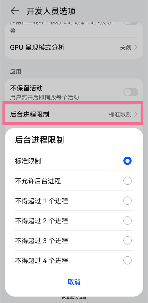 3、点击【后台进程限制】,选择不允许后台运行程序个数即可。