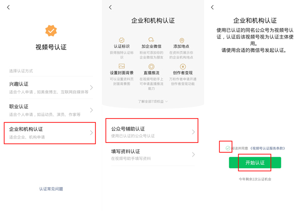3、点击【企业和权机构认证】,点击【公众号辅助认证】,勾选协议,点击【开始认证】,根据提示操作即可。