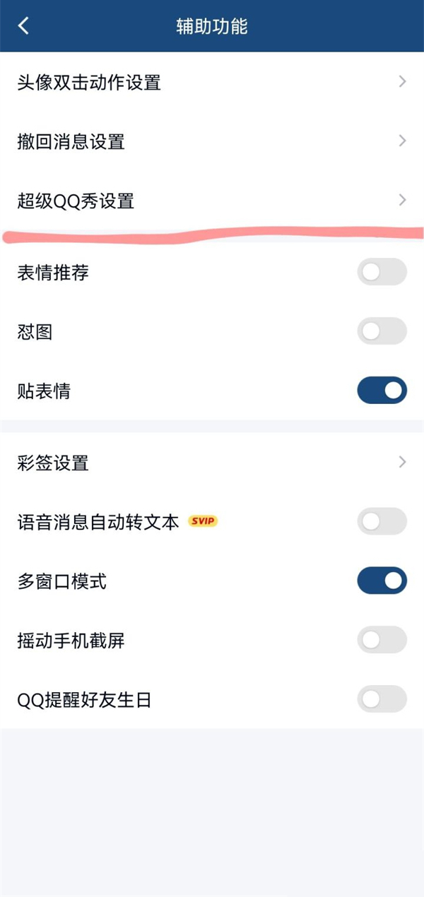 3、在辅助功能页面点击超级QQ秀设置。