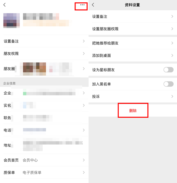 3、点击右上方三点,点击【删除】即可删除企业微信联系人。