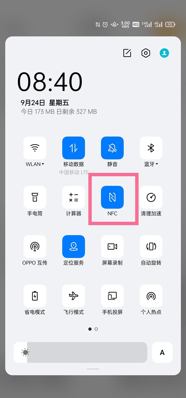 也可从屏幕顶部下拉呼出状态栏,点亮【NFC】图标。