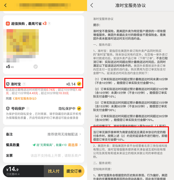 2、在提交订单页面找到并勾选【准时宝】即可。